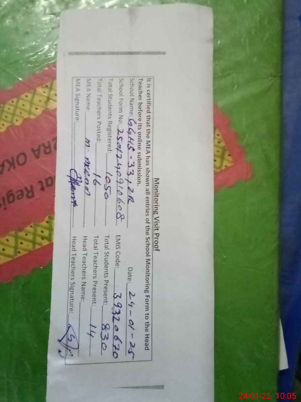 | Attendance Register | Head Teacher | MEA with School | Visit Proof |