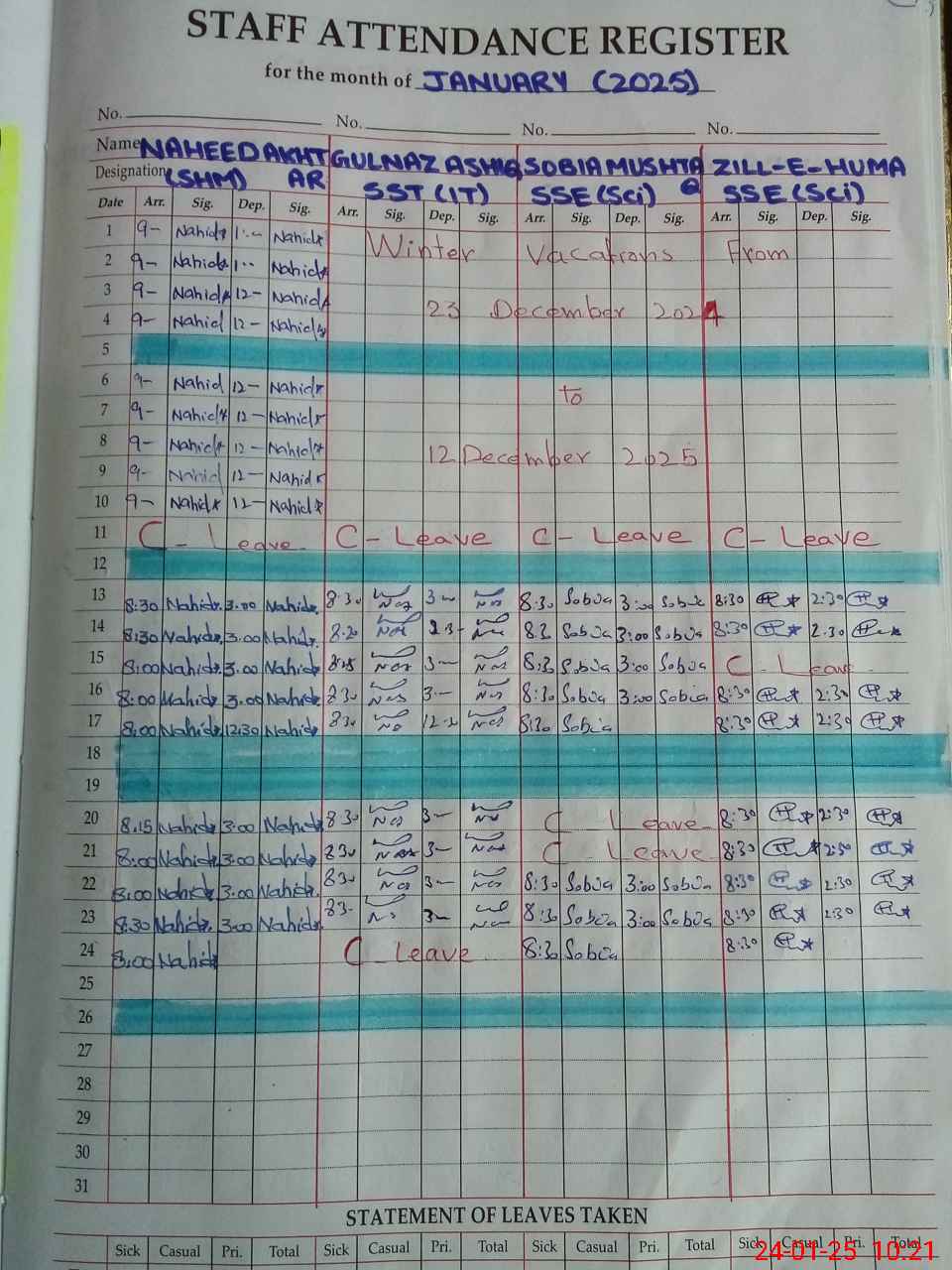 | Leave | Duty | Absent | Maternity | Medical | Ex- Pak |