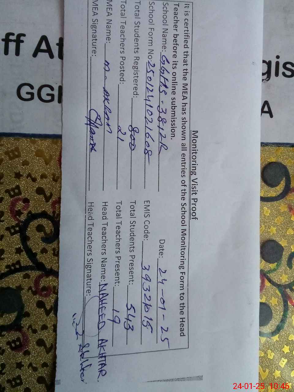 | Certified that this School was Inspected by the Undersigned MEA/DMO Today and the Information Stated Above is as Per Record. | |||||
