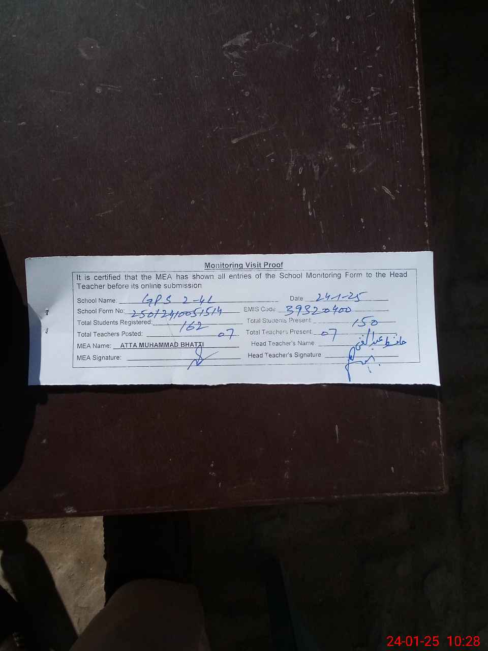 | Attendance Register | Head Teacher | MEA with School | Visit Proof |
