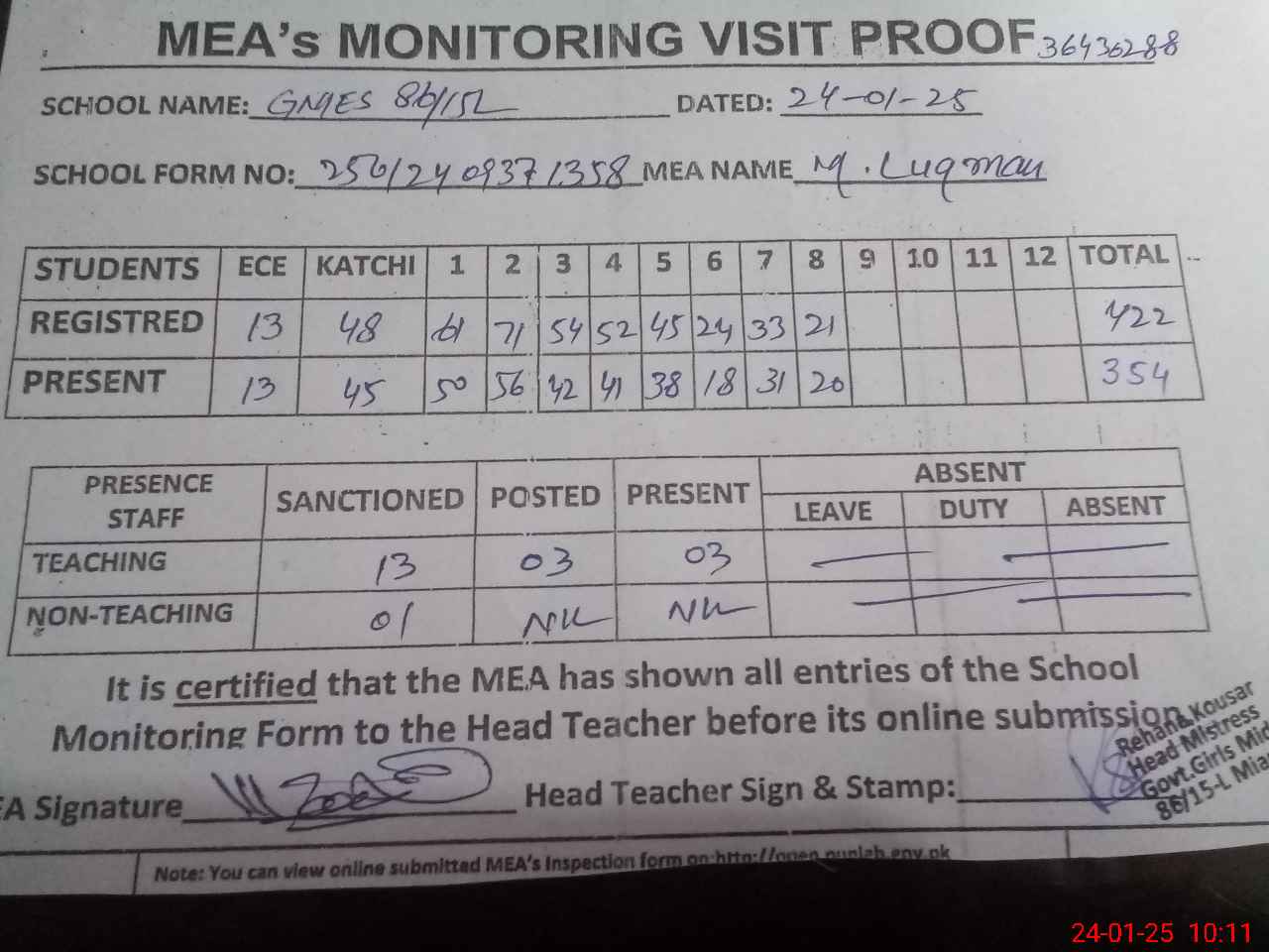 | Certified that this School was Inspected by the Undersigned MEA/DMO Today and the Information Stated Above is as Per Record. | |||||