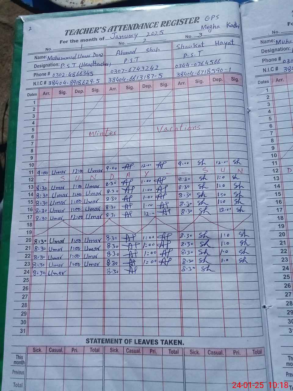 | CNIC | Full Name | Designation | R/C | Absence during last cal. month |