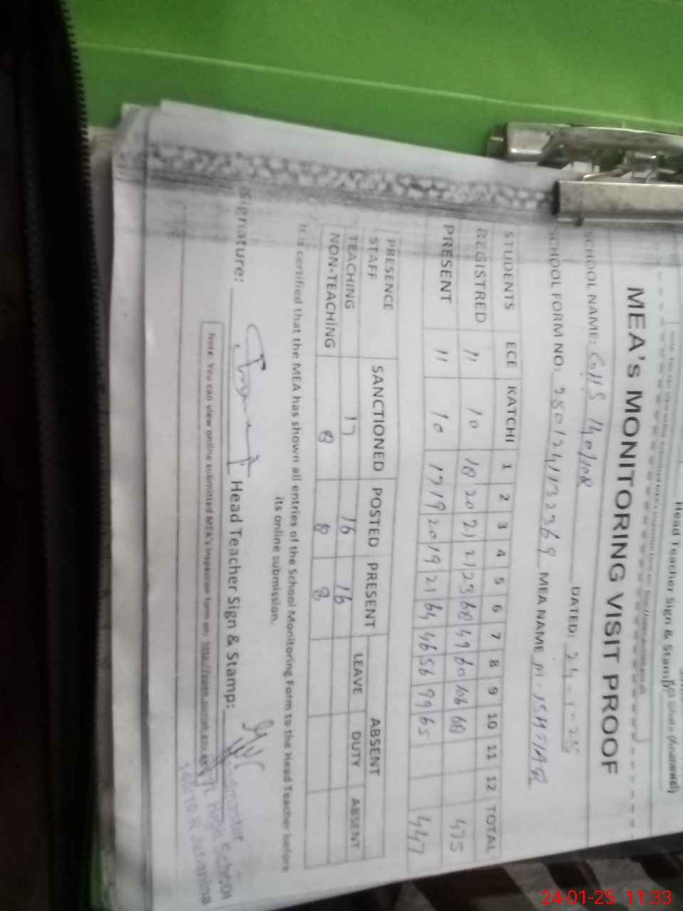 | Attendance Register | Head Teacher | MEA with School | Visit Proof |