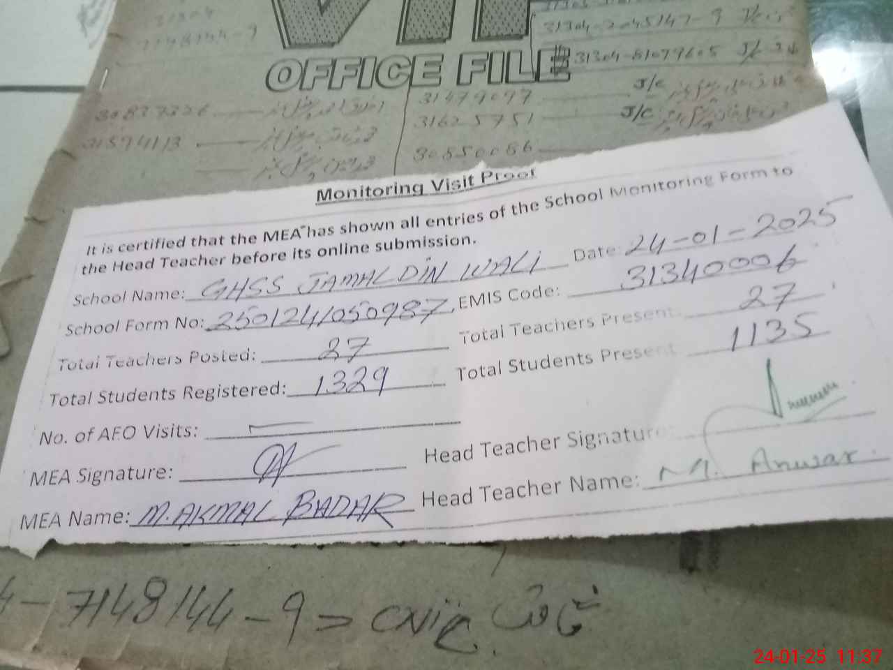 | Certified that this School was Inspected by the Undersigned MEA/DMO Today and the Information Stated Above is as Per Record. | |||||