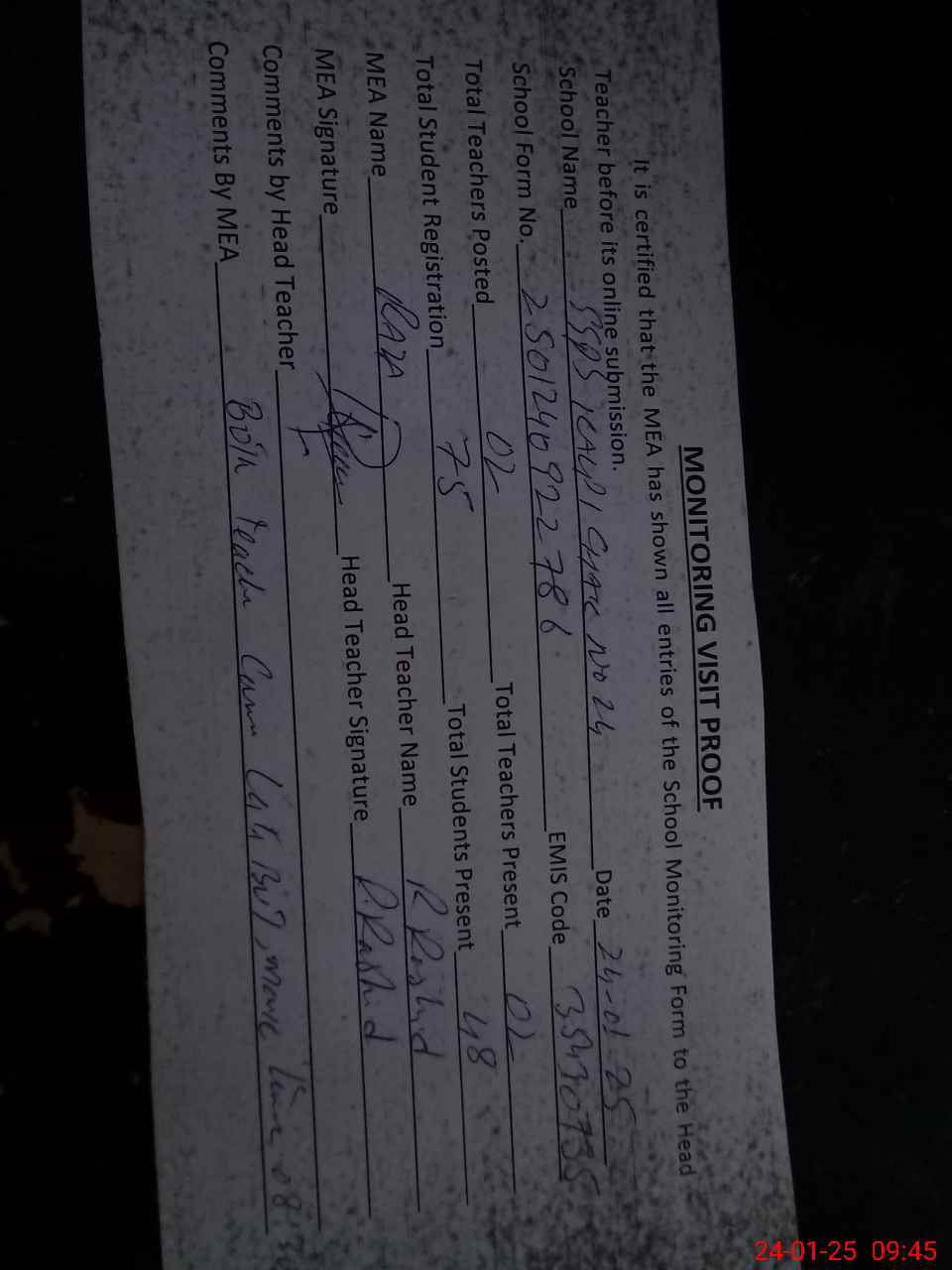| Attendance Register | Head Teacher | MEA with School | Visit Proof |