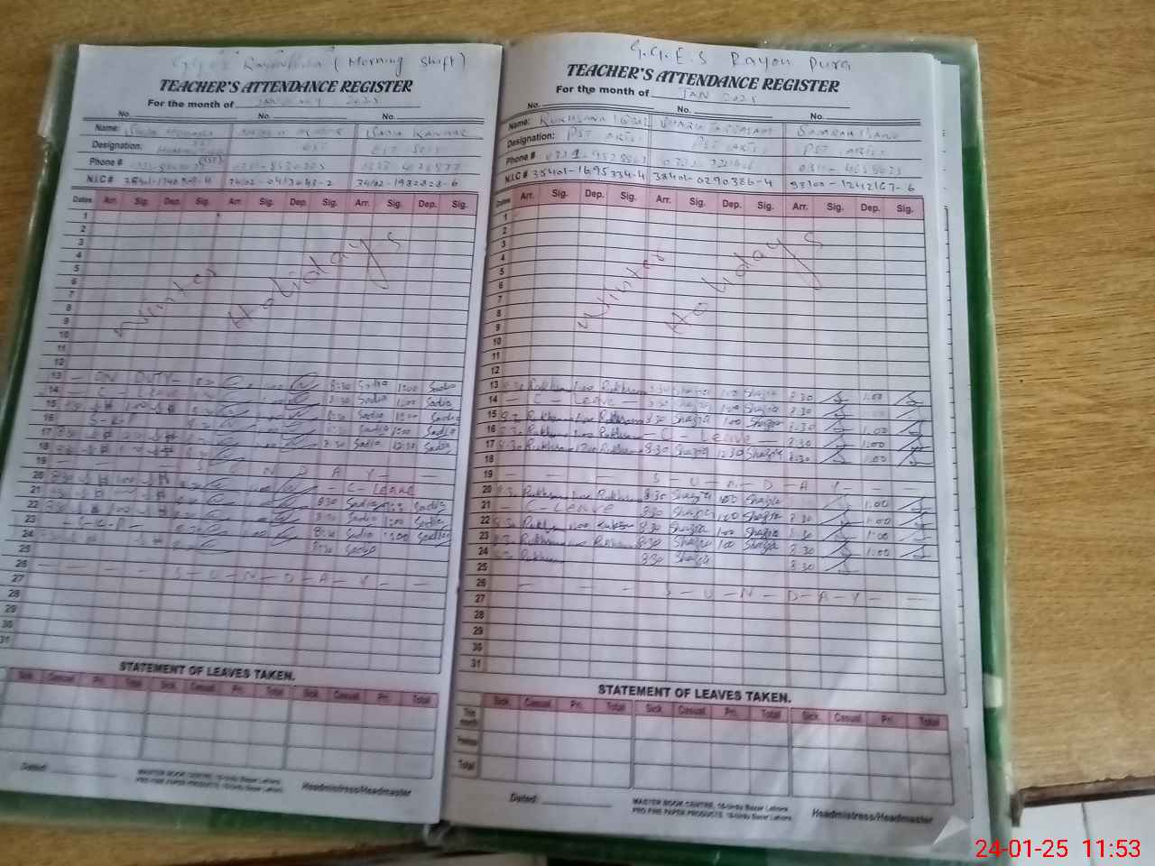 | CNIC | Full Name | Designation | R/C | Absence During Last Calender Month |