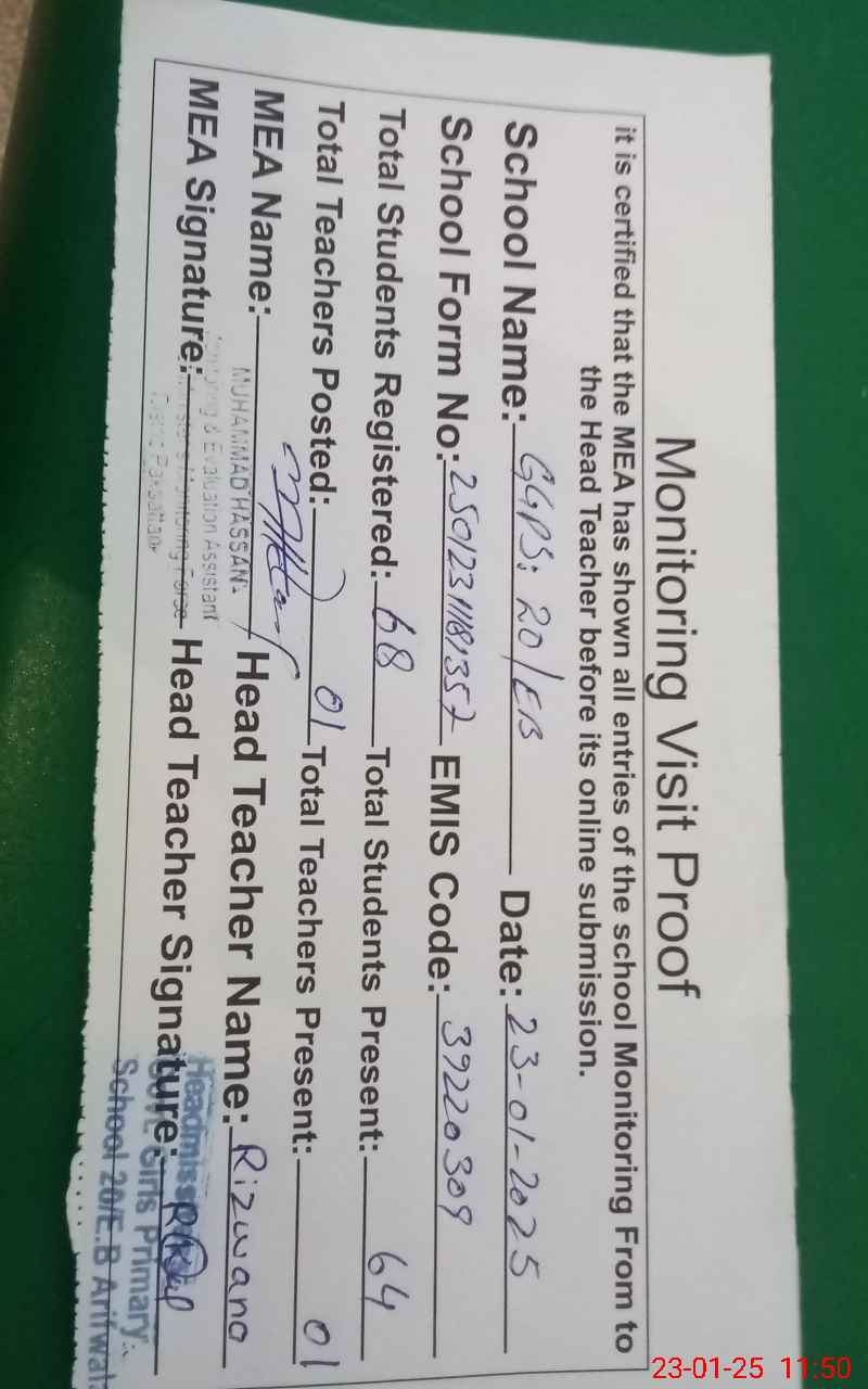 | Attendance Register | Head Teacher | MEA with School | Visit Proof |