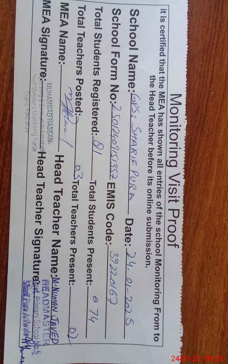 | EMIS Code: 39220167 | Name of School: GPS MOHALLA SHARIF PURA | |||