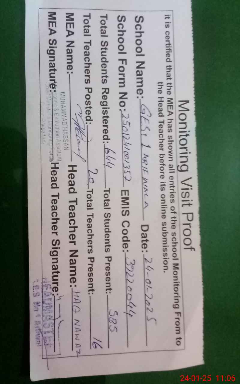 | EMIS Code: 39220044 | Name of School: GES NO. 1 ARIF WALA | |||