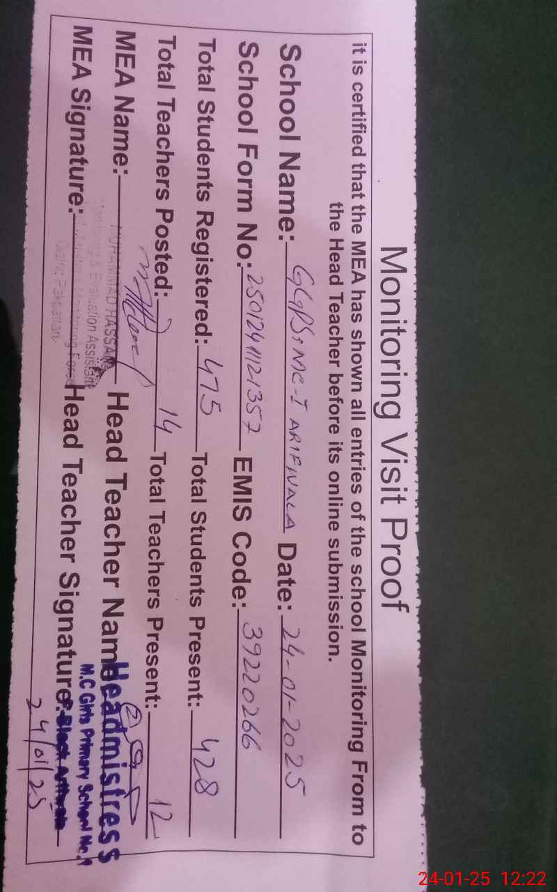 | EMIS Code: 39220266 | Name of School: GGPS MC NO. 1 F BLOCK ARIF WALA | |||