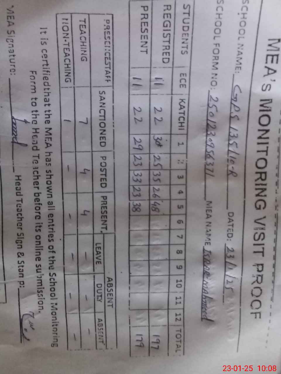 | Attendance Register | Head Teacher | MEA with School | Visit Proof |