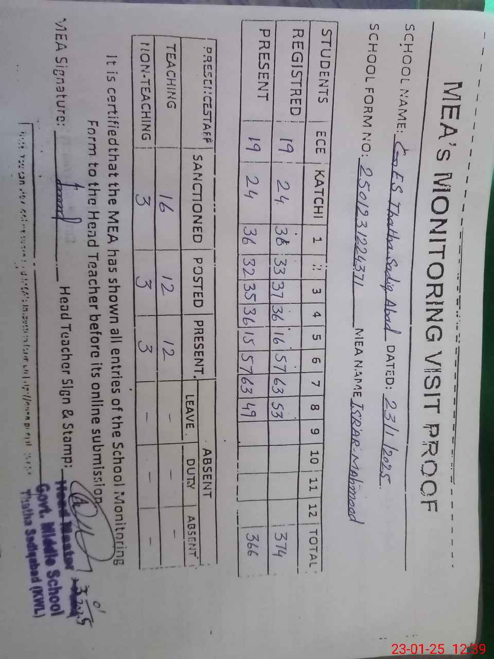 | Attendance Register | Head Teacher | MEA with School | Visit Proof |