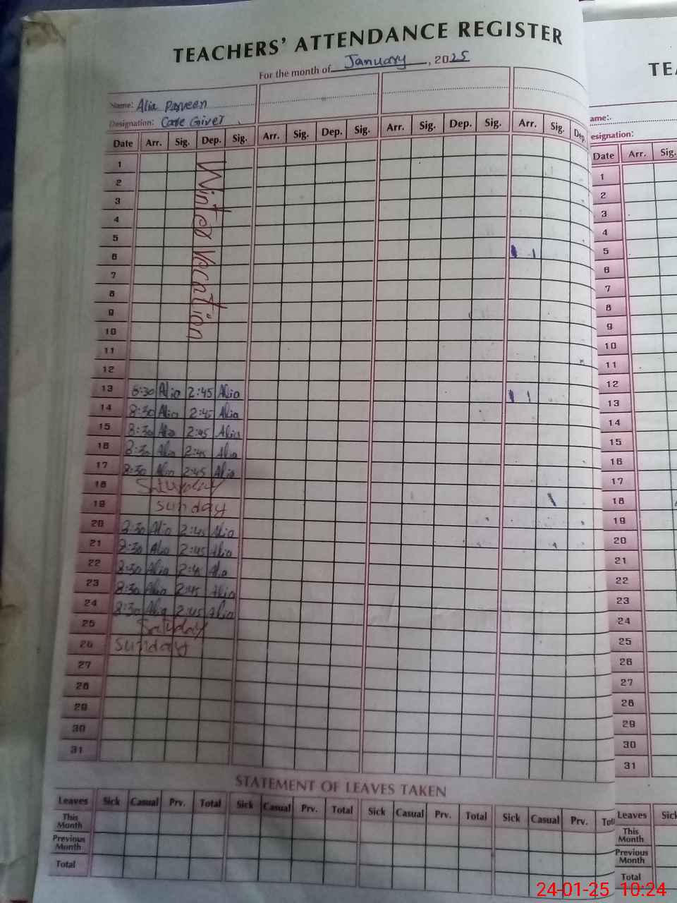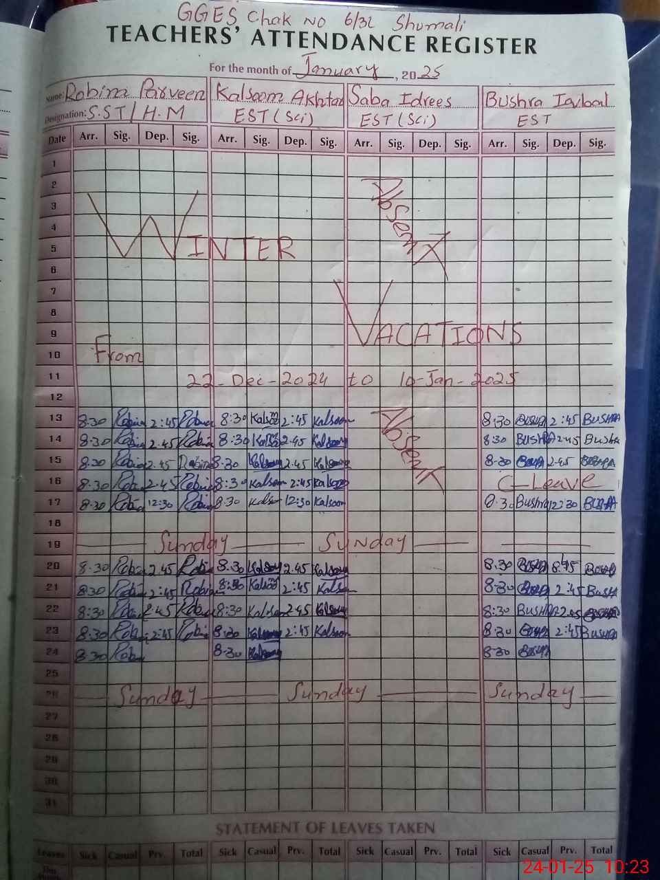 | Remarks (Use Separate Page if Required): EST Saba Idrees found absent since October 2024 Attendance was not marked on SIS | |||||