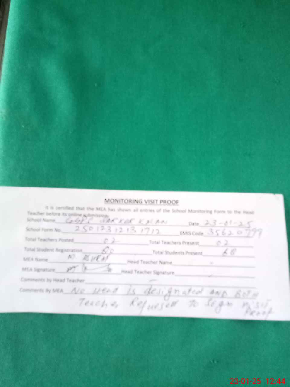 | Remarks (Use Separate Page if Required): No head teacher is designated and both teachers pst Misbah al fatima and pst teacher munaza Nazeer refused to sign visit proof | |||||