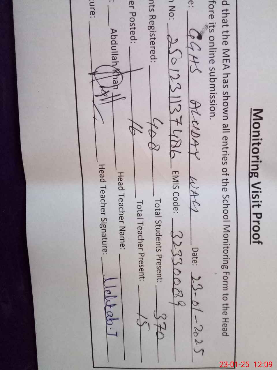 | EMIS Code: 32330089 | Name of School: GGHS ALODAY WALI | |||