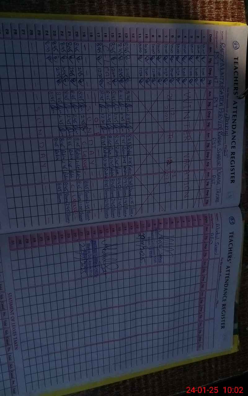 | Total no. of Classrooms: 5 No. of Classrooms Used for Teaching: 3 No. of Classrooms Storing Old Furniture, FTBs, etc: 0Comments if Any: Sir students attendence on sis not carried out NSB record not updated |