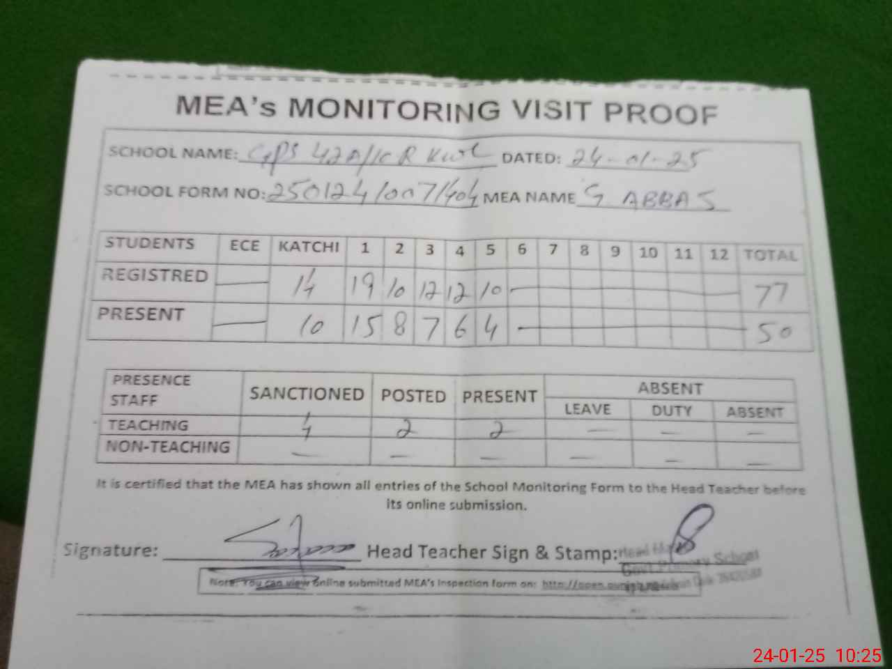 | Attendance Register | Head Teacher | MEA with School | Visit Proof |
