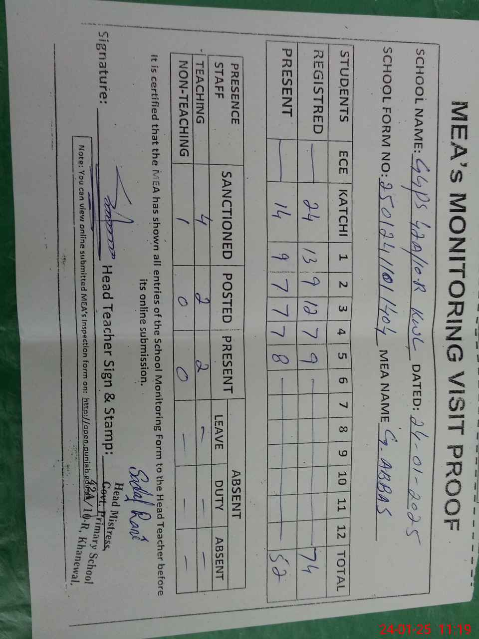 | Attendance Register | Head Teacher | MEA with School | Visit Proof |
