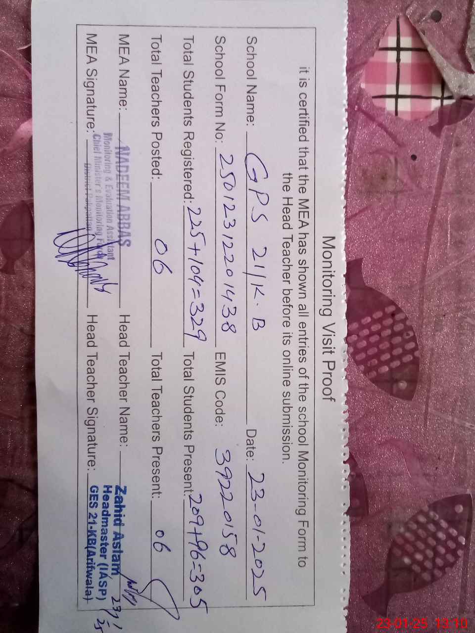 | EMIS Code: 39220158 | Name of School: GPS CHAK NO. 21 KB | |||