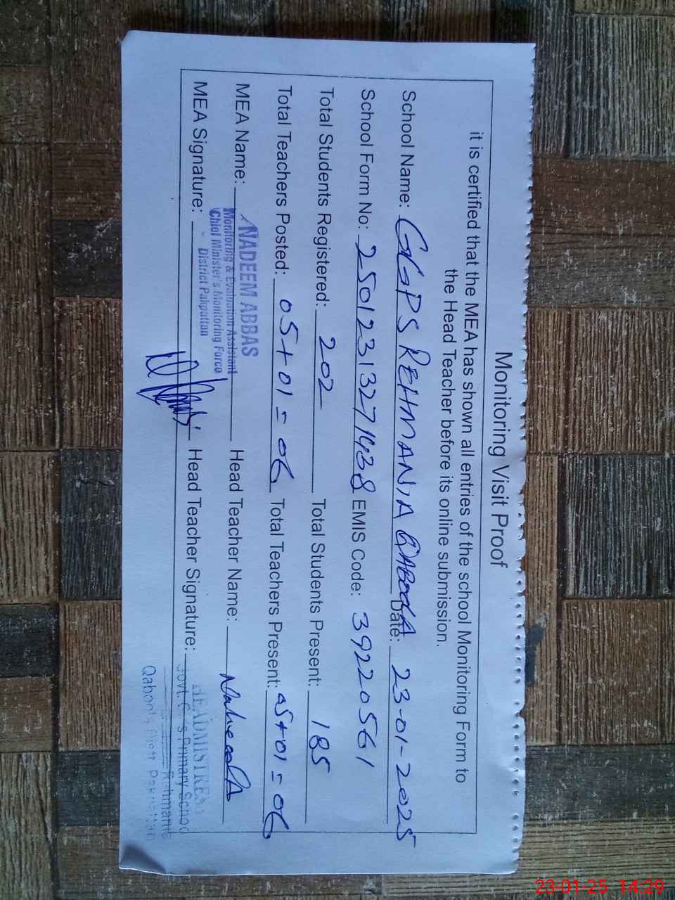 | EMIS Code: 39220561 | Name of School: GGPS REHMANIA QABOOLA | |||