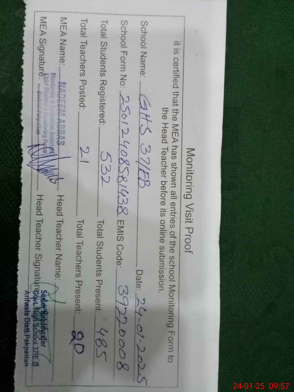 | Attendance Register | Head Teacher | MEA with School | Visit Proof |