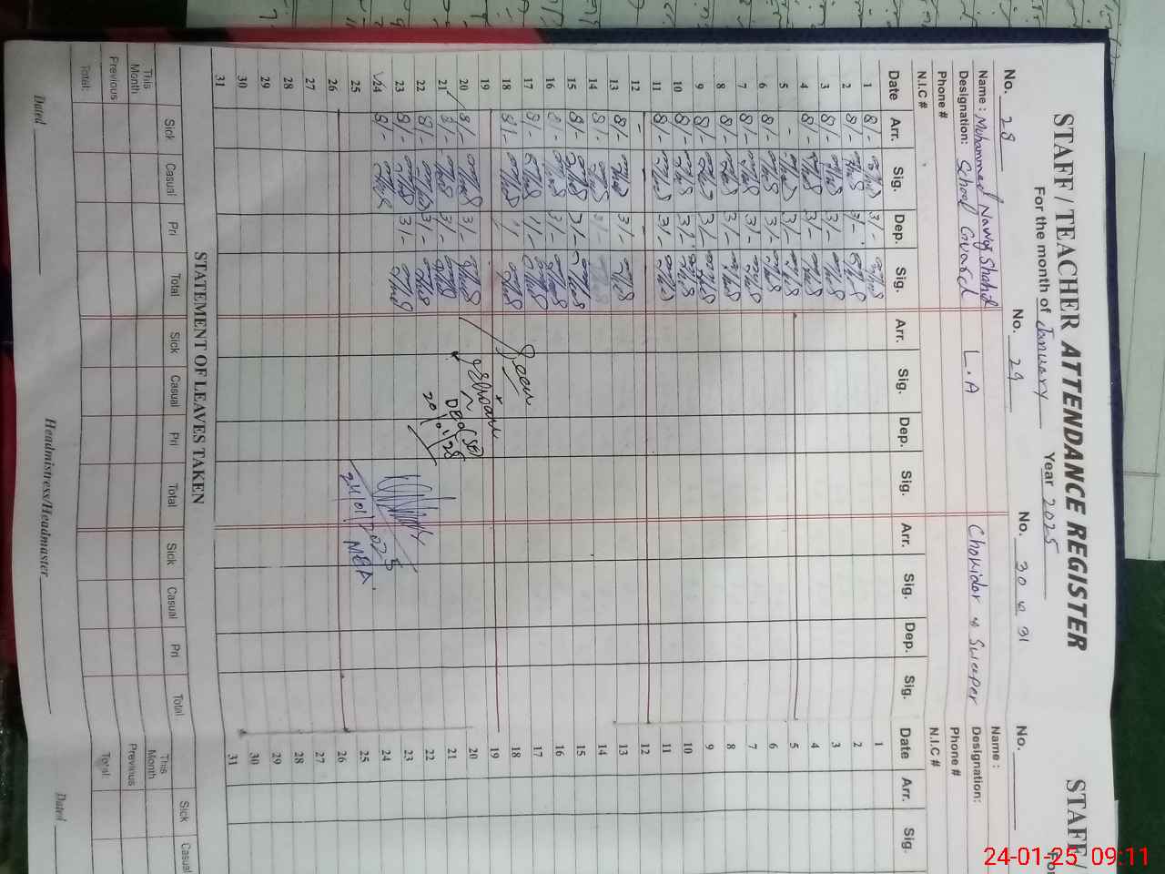 | CNIC | Full Name | Designation | R/C | Absence During Last Calender Month |