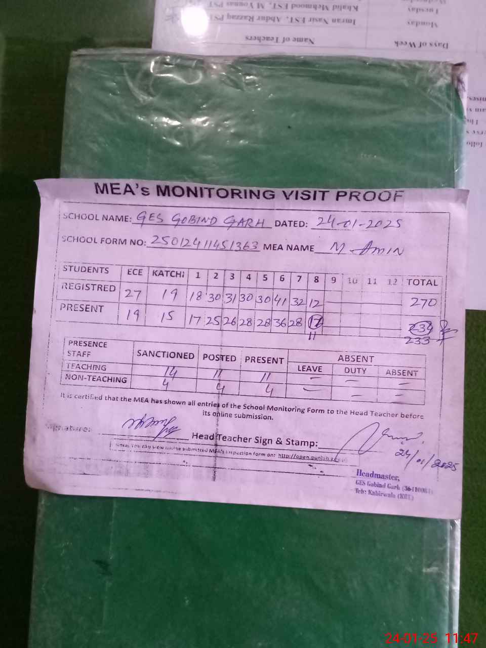 | Attendance Register | Head Teacher | MEA with School | Visit Proof |