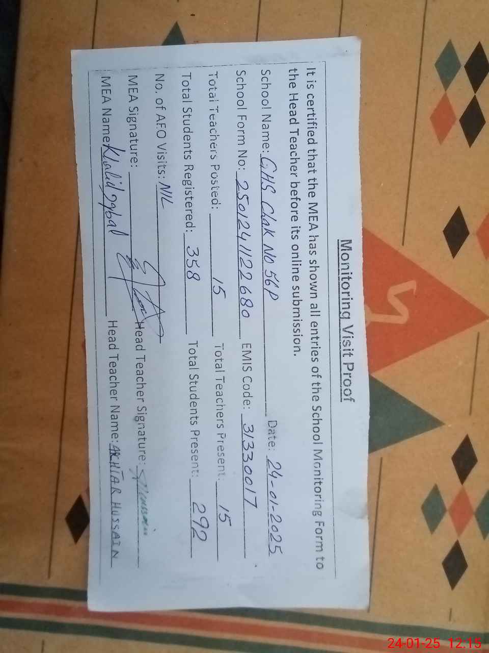 | Attendance Register | Head Teacher | MEA with School | Visit Proof |