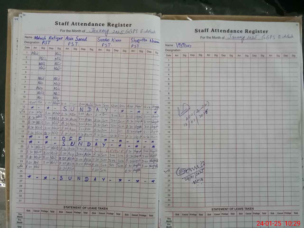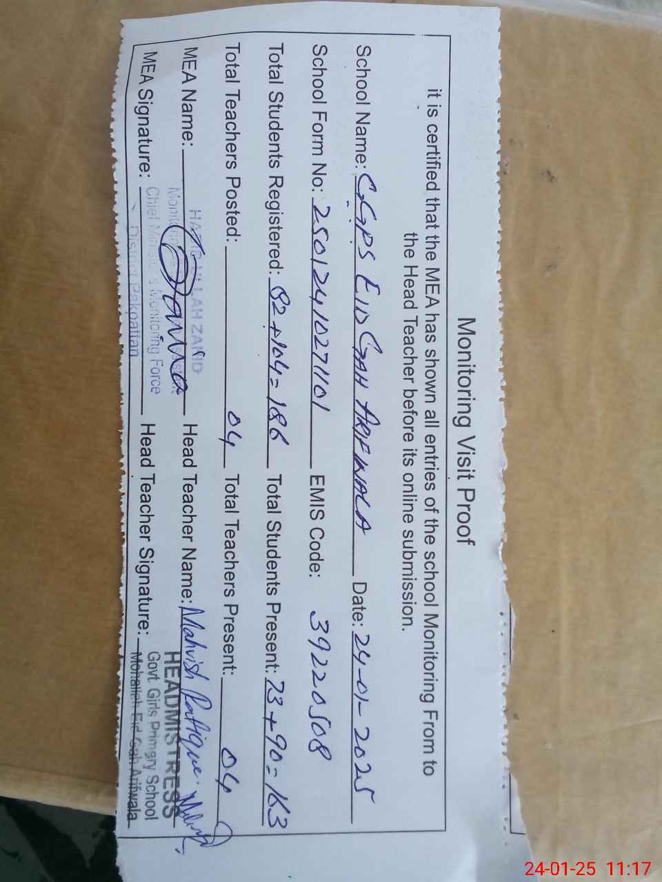 | Attendance Register | Head Teacher | MEA with School | Visit Proof |