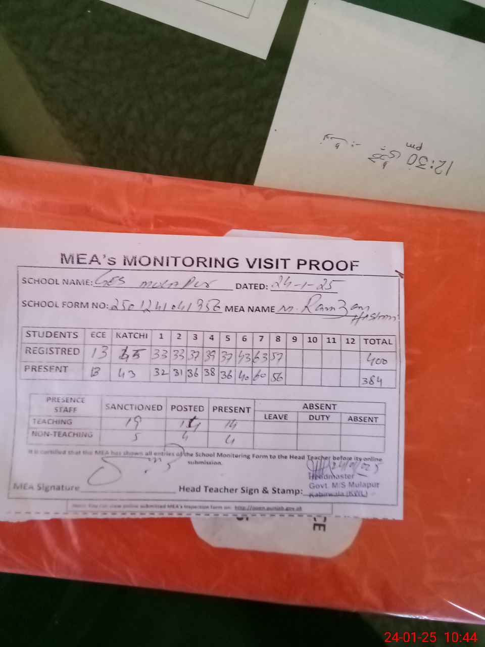 | Attendance Register | Head Teacher | MEA with School | Visit Proof |