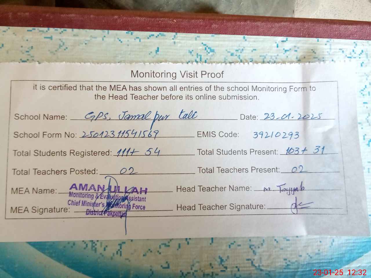 | Attendance Register | Head Teacher | MEA with School | Visit Proof |