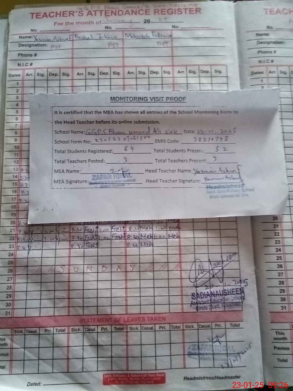 | Attendance Register | Head Teacher | MEA with School | Visit Proof |