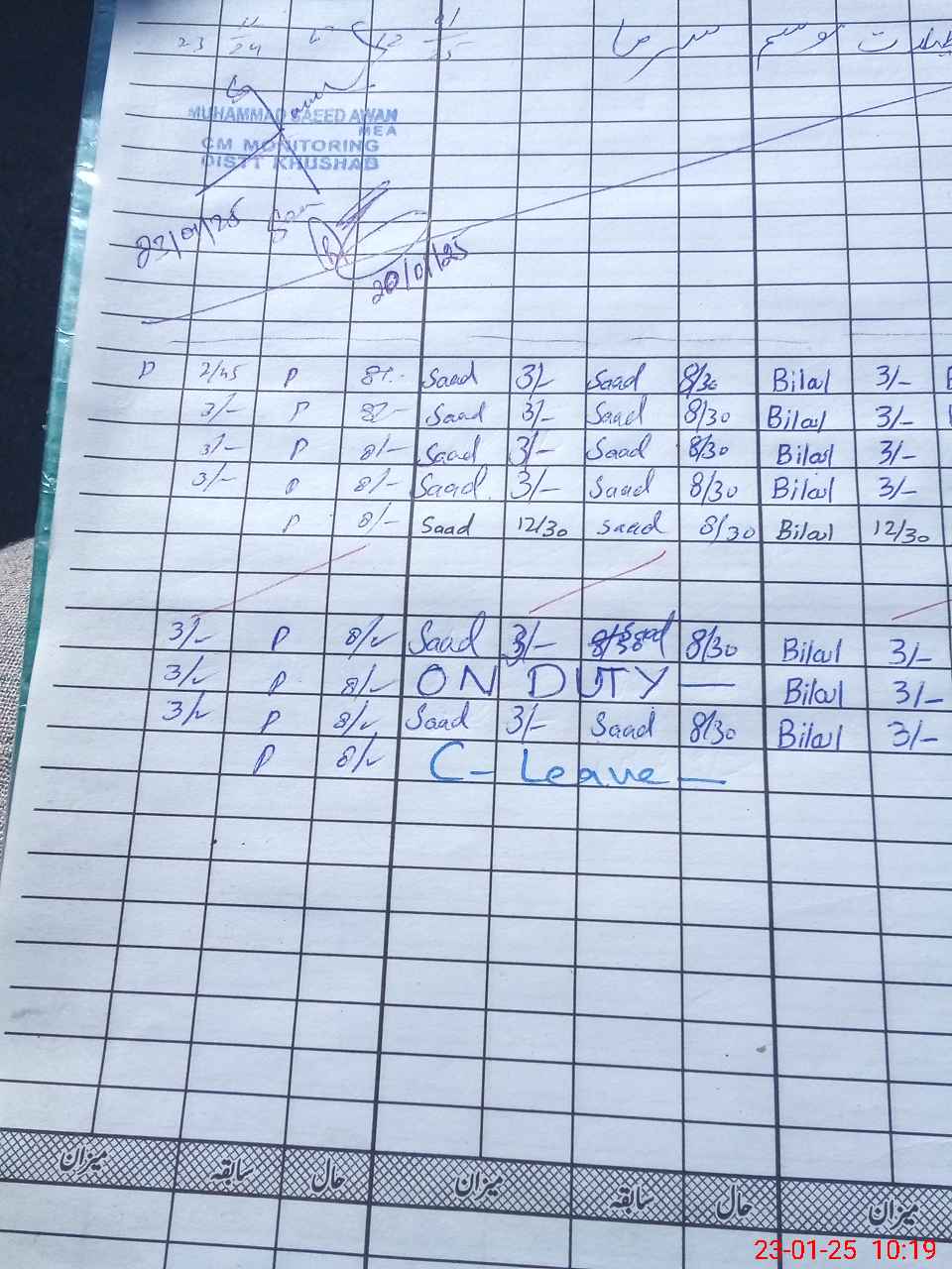 | CNIC | Full Name | Designation | R/C | Absence during last cal. month |