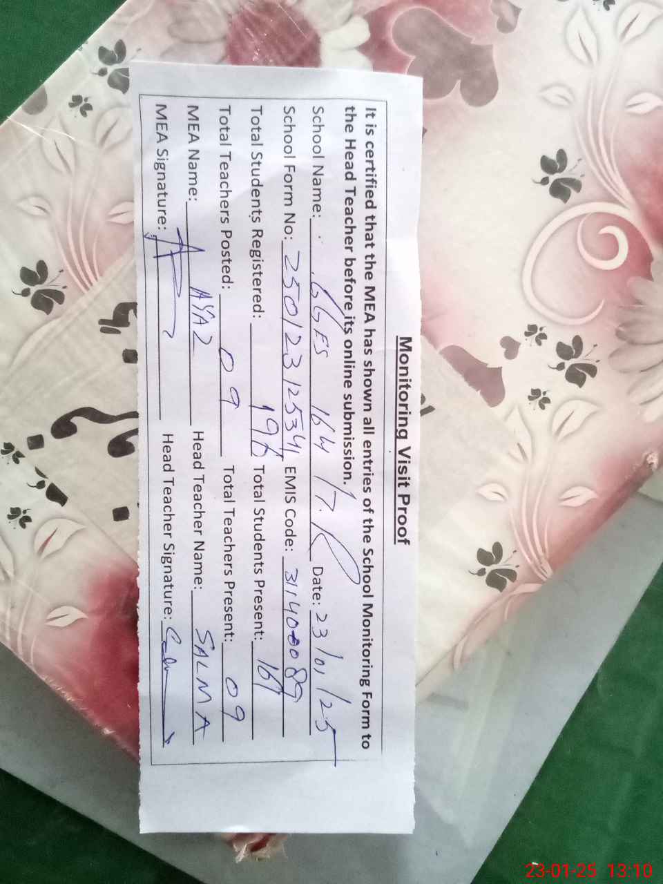 | Attendance Register | Head Teacher | MEA with School | Visit Proof |