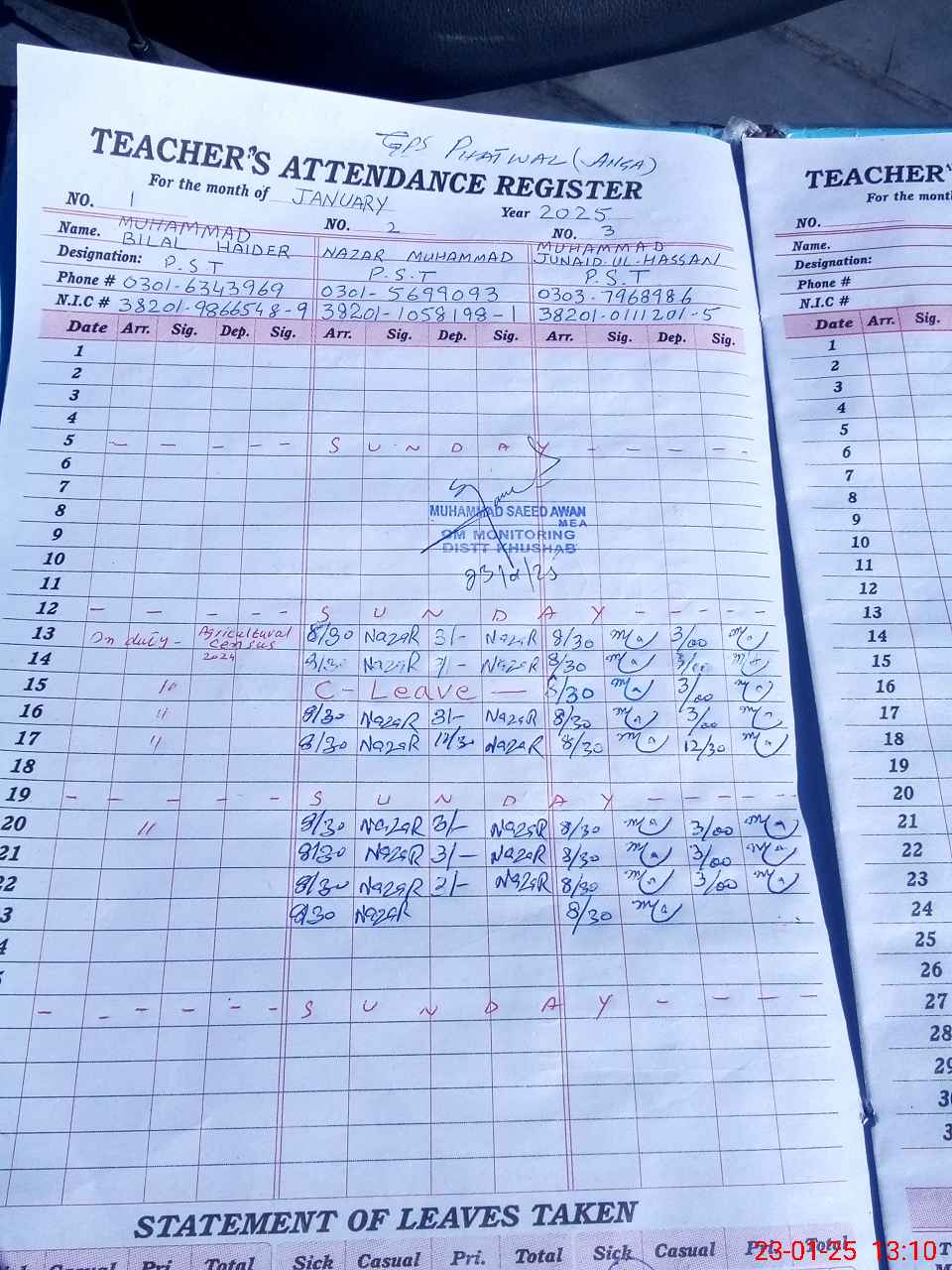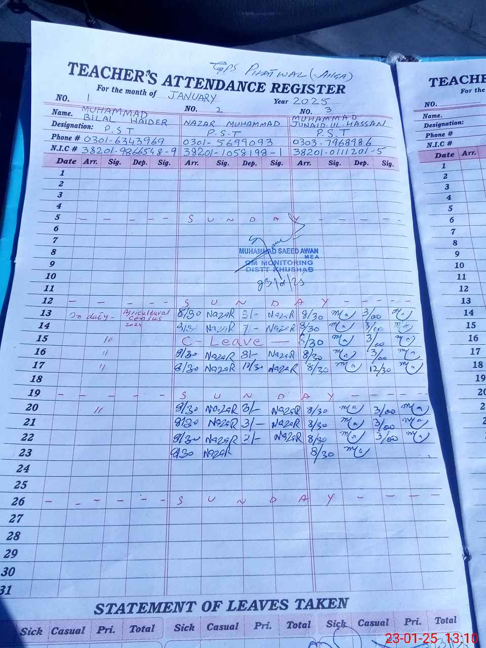 | Name: Mu**** Bi**** Designation: (School Headmaster's/Headmistress's) PST Phone/Cell Number: 03**** |