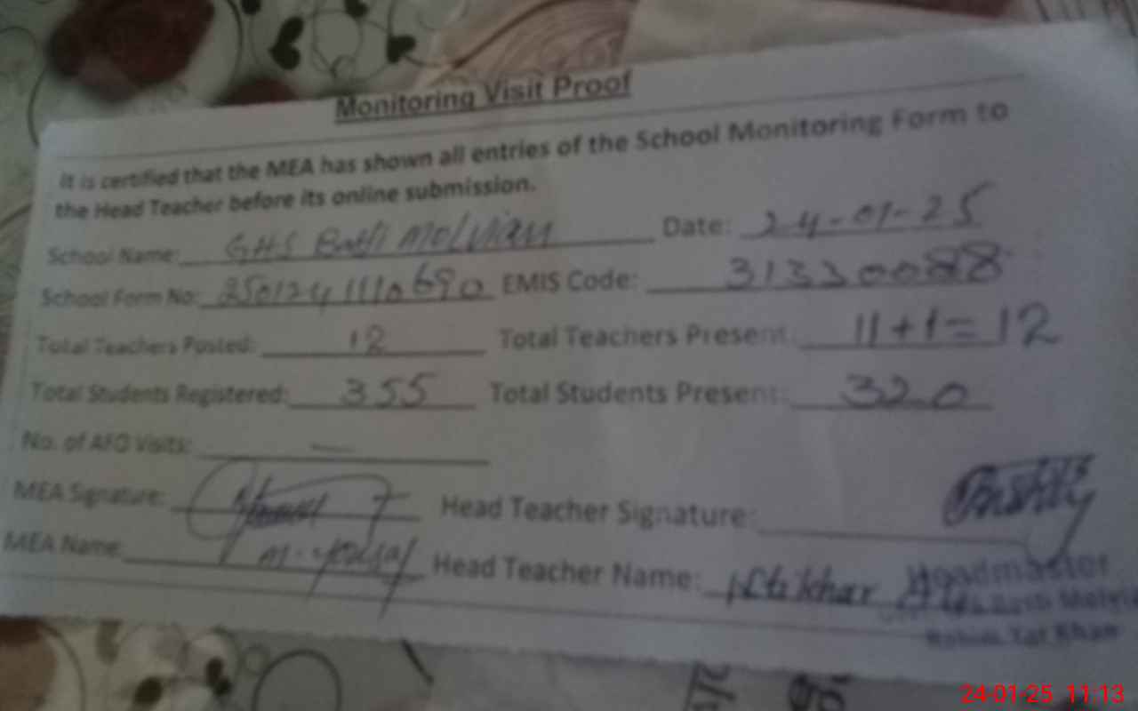 | Name: If**** Al**** Designation: (School Headmaster's/Headmistress's) S S T Phone/Cell Number: 03**** |