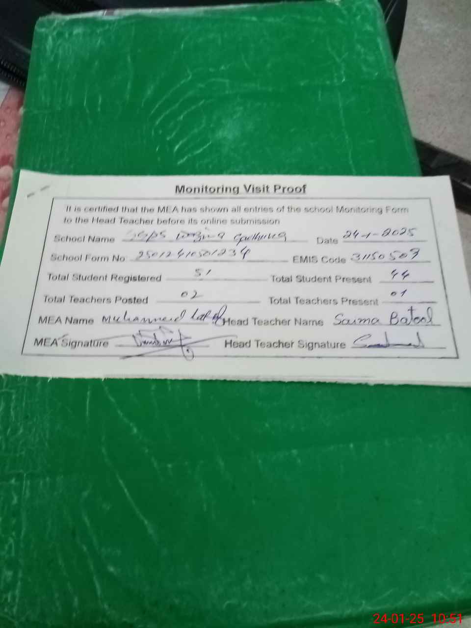 | Attendance Register | Head Teacher | MEA with School | Visit Proof |