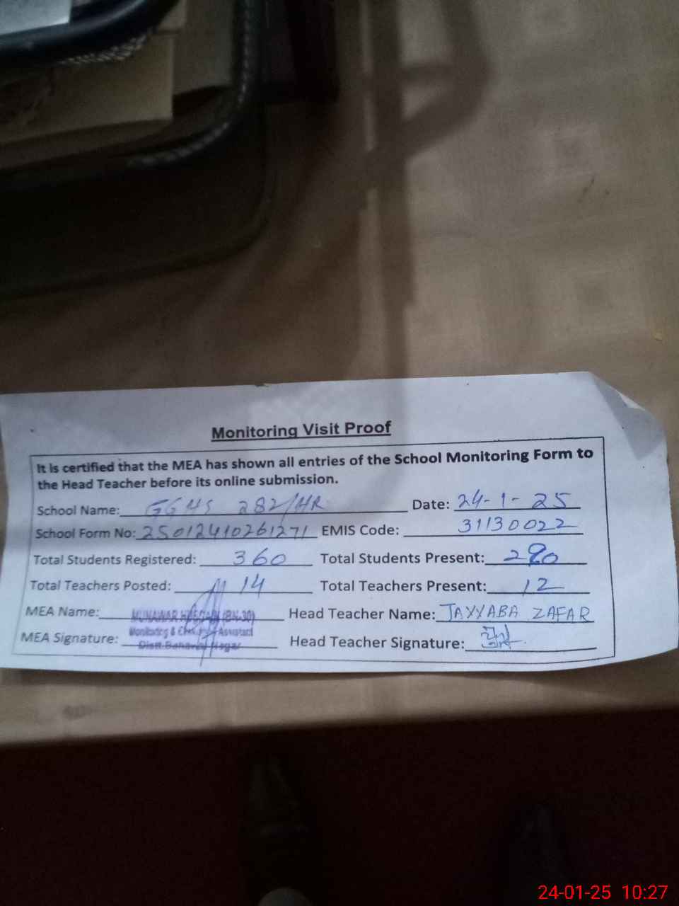 | Attendance Register | Head Teacher | MEA with School | Visit Proof |