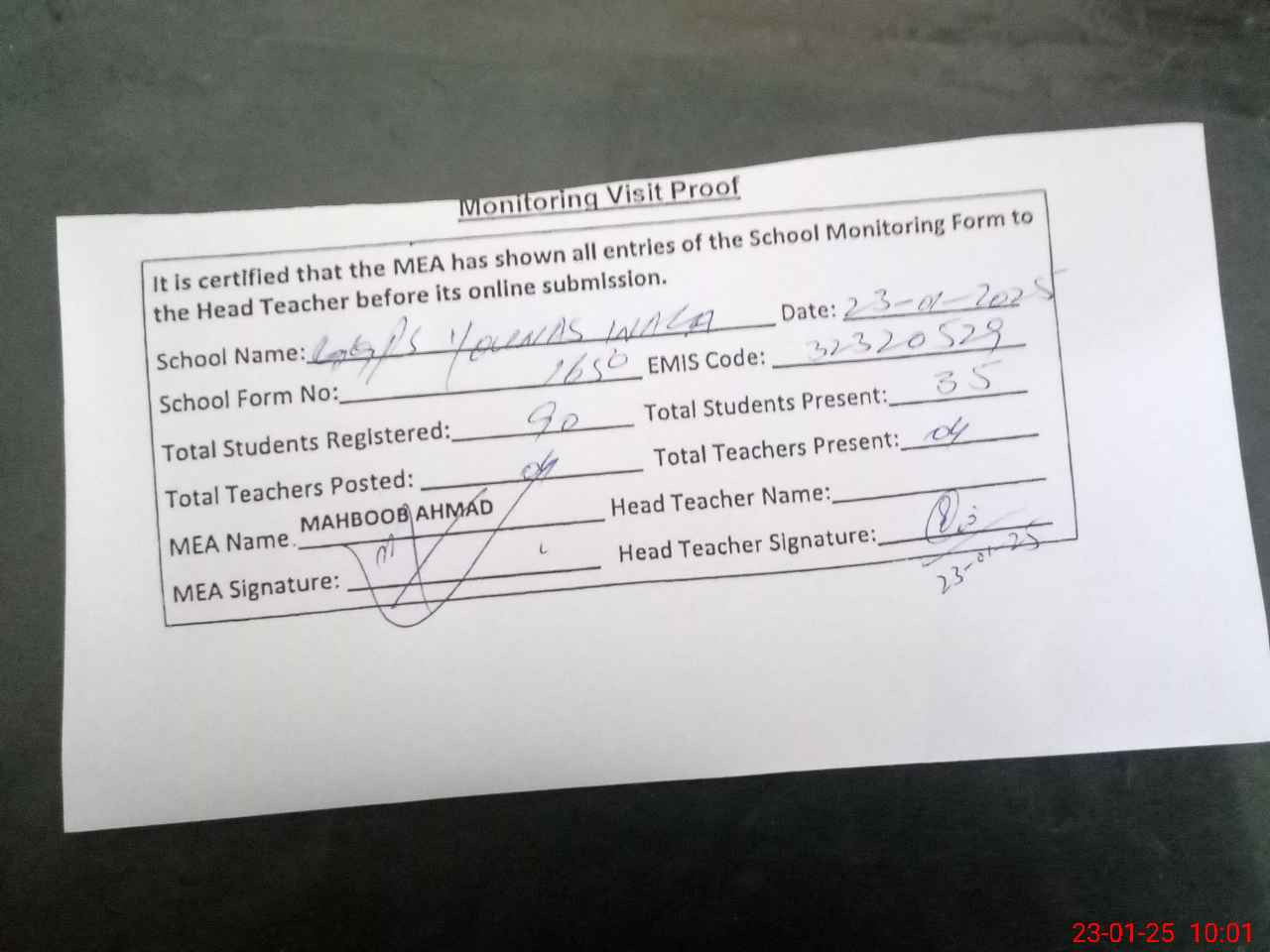 | Attendance Register | Head Teacher | MEA with School | Visit Proof |