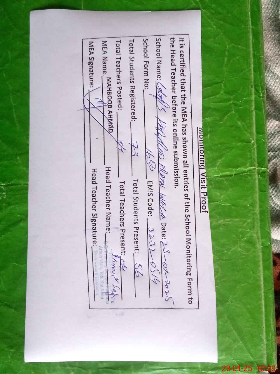 | Attendance Register | Head Teacher | MEA with School | Visit Proof |