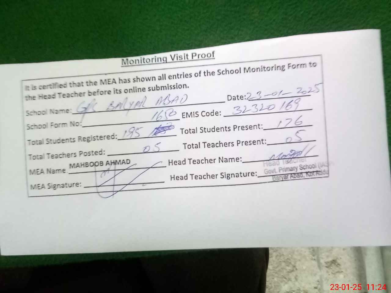 | Attendance Register | Head Teacher | MEA with School | Visit Proof |