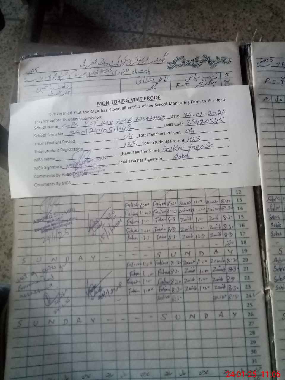 | Attendance Register | Head Teacher | MEA with School | Visit Proof |