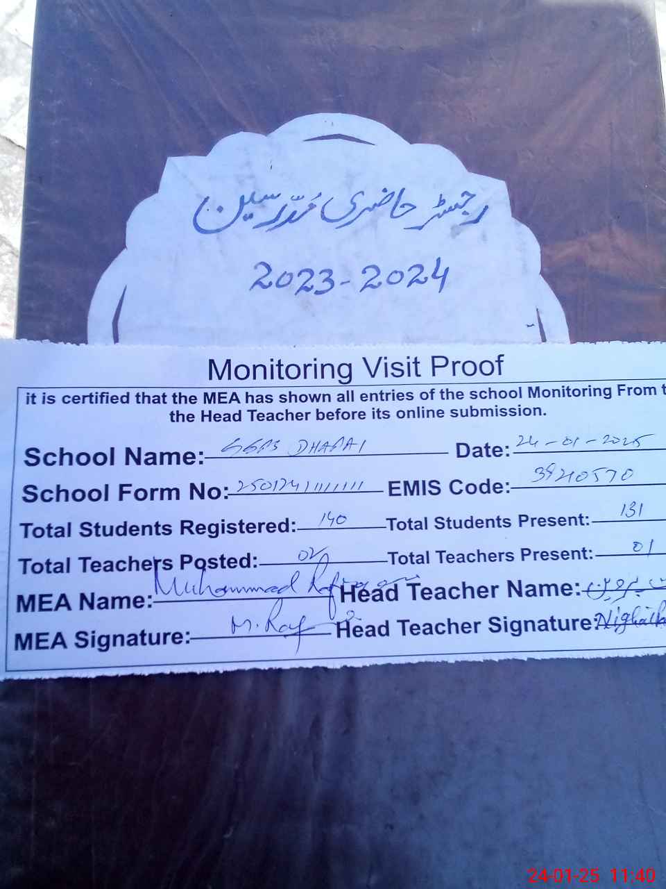 | Attendance Register | Head Teacher | MEA with School | Visit Proof |
