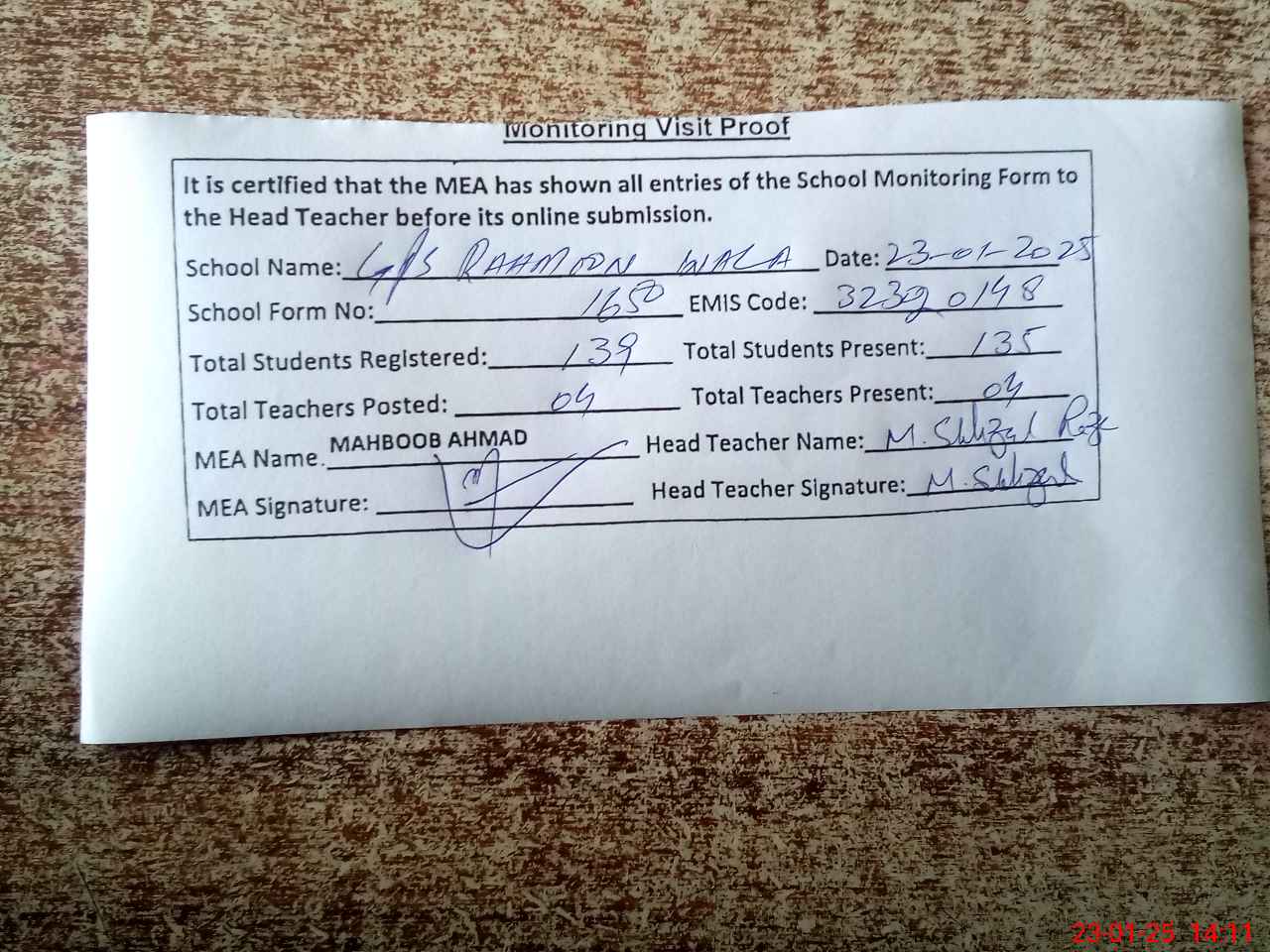 | Attendance Register | Head Teacher | MEA with School | Visit Proof |