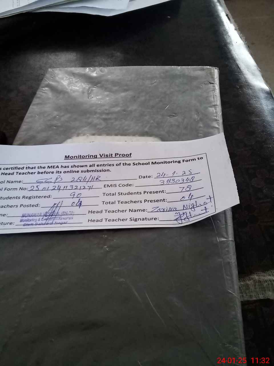 | Name: Za**** Ni**** Designation: (School Headmaster's/Headmistress's) EST Phone/Cell Number: 03**** |