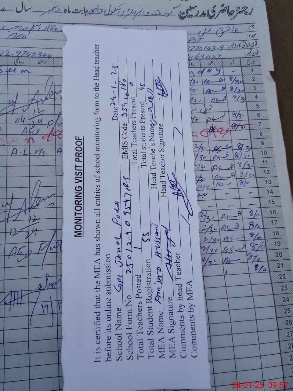 | Attendance Register | Head Teacher | MEA with School | Visit Proof |