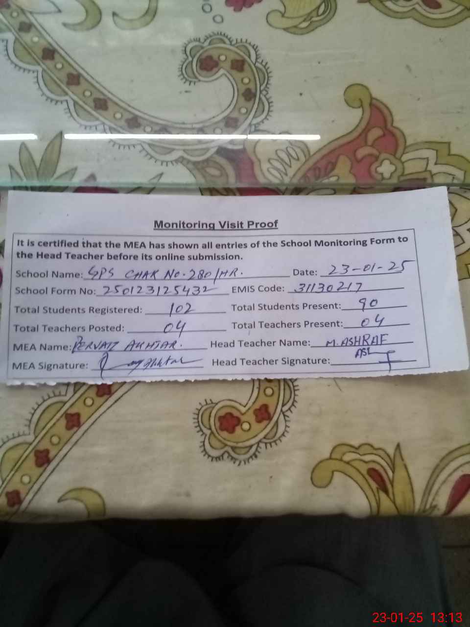 | Attendance Register | Head Teacher | MEA with School | Visit Proof |