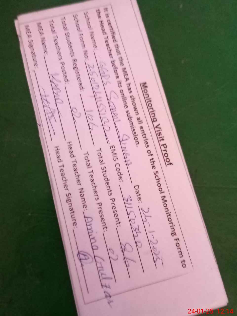 | Attendance Register | Head Teacher | MEA with School | Visit Proof |