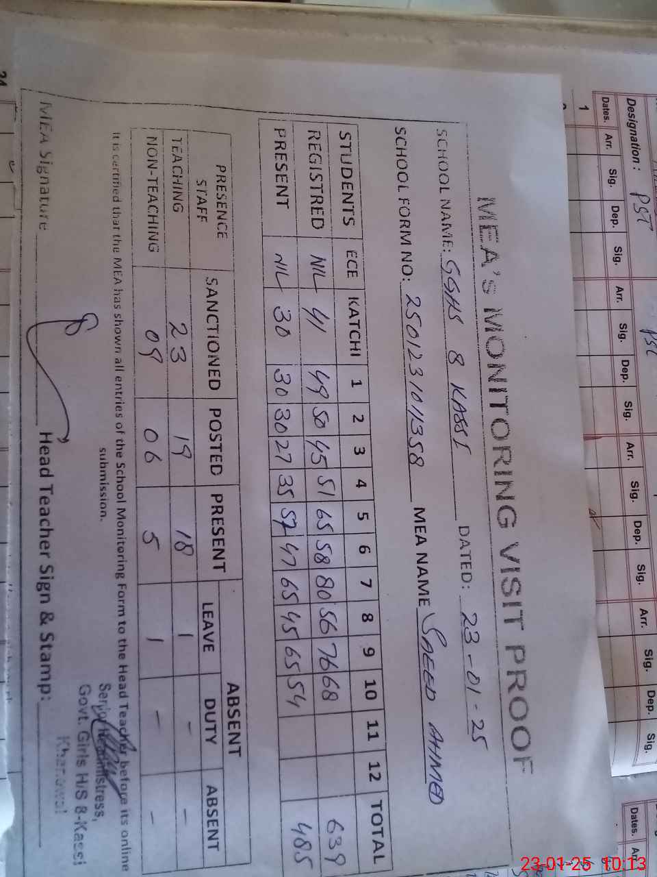 | Attendance Register | Head Teacher | MEA with School | Visit Proof |