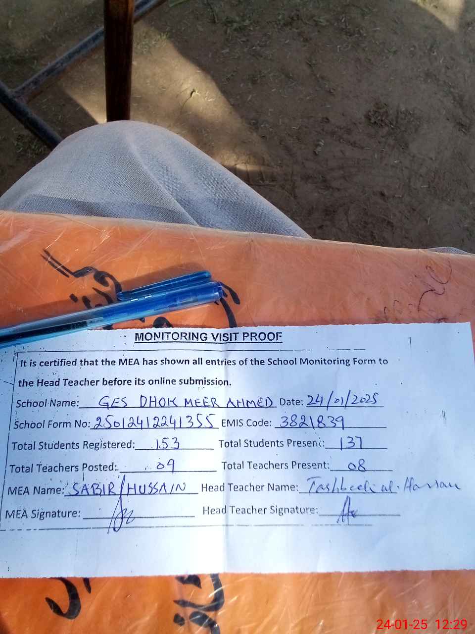 | Attendance Register | Head Teacher | MEA with School | Visit Proof |